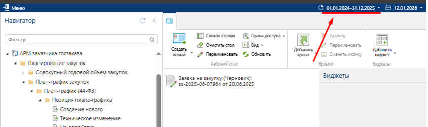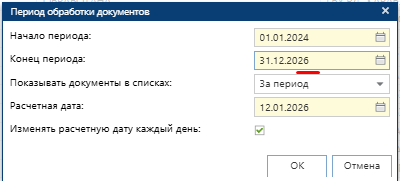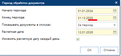 После нажатия мы видим следующее окно. Как видно на скриншоте, что расчетная дата 12.01.2026 не входит в период 01.01.2024 и 31.12.2025, поэтому необходимо откорректировать Конец период с 31.12.2025 на 31.12.2026, либо 31.12.2027 (на усмотрение пользователя).
